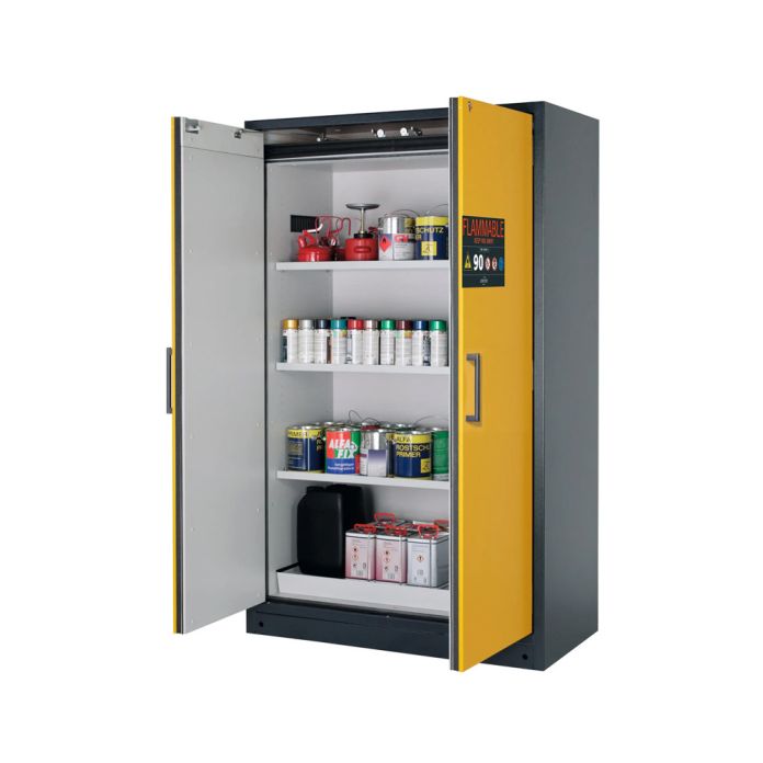Doppeltüriger Sicherheits-Hochschrank für sichere und vorschriftsmässige Lagerung entzündbarer Gefahrstoffe in Arbeitsräumen.